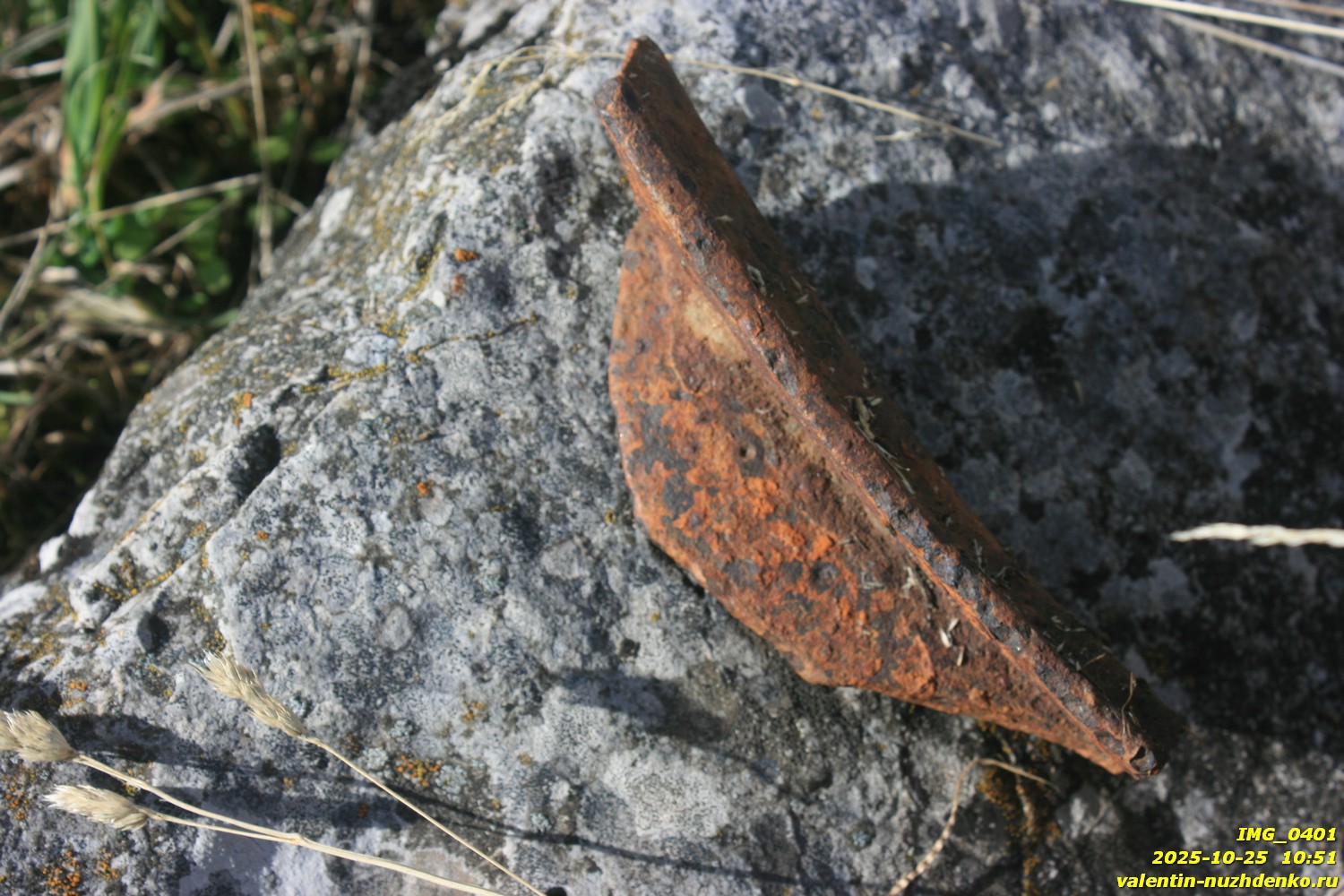 Рядом с кошарой, у основания скалы найден фрагмент с ручкой толстого чугунного казана большого диаметра.