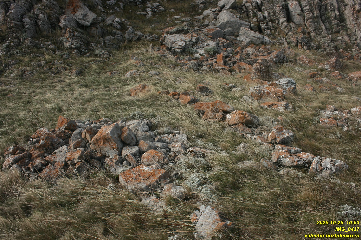 В 20 метрах северо-западнее кошары находится куча камней. Еще две подобных кучи и сложенная цепочка камней расположены еще дальше, на расстоянии 40 метров от кошары у самого подножия скалы. Данные объекты не имеют вид развалов, но больше похожи склады камня. Возможно, что в этом районе находилась небольшая каменоломня по заготовке камня для кладок.